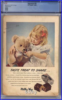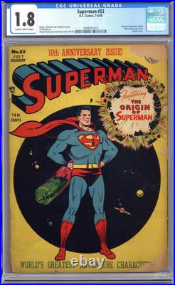 Comic Book Value Packs. Key Comics & First Appearances. Good Girl Art Comics. Superman #53 CGC 1.8 1948 4498341010. Any CGC case may have minor imperfections including Newton rings, scuffs, standard surface wear, or minor cracks. CGC considers these defects acceptable, as do we. If there is any significant damage to the slab it will be noted in our description, and we will not list any slabbed comics with a damaged case that compromises the integrity of the grade. Cover pencils by Wayne Boring, inks by Stan Kaye. List of Superman’s accomplishments in the real world. The Origin of Superman, script by Bill Finger, pencils by Wayne Boring, inks by Stan Kaye; After a prologue that demonstrates Superman’s amazing abilities, his origin is recounted. Tootsie Rolls ad, art by C. The Oracle From, script by Alvin Schwartz, art by Al Plastino; Professor Grog accidentally sends Superman and mechanic Mike Mooney back to ancient Egypt. Shorty humor two-pager by Henry Boltinoff. The Tiniest Things In the World text article by Joe Samachson [as William Morrison]. A Job For Superhombre, script by Don Cameron, art by Al Plastino. 52 Pages, Full Color. This item is a consignment. This item is a consignment, which means that the price has been set by the consignor rather than by MyComicShop. We take pride in our accurate, consistent grading. You can be confident in receiving a well-graded comic when ordering from us. We understand that condition is important to collectors. We opened our first comic retail store in 1977 and operated a chain of eight comic book stores in the 80s, 90s, and 2000s before going online-only. Check out our website for more info. & Lone Star Comics.